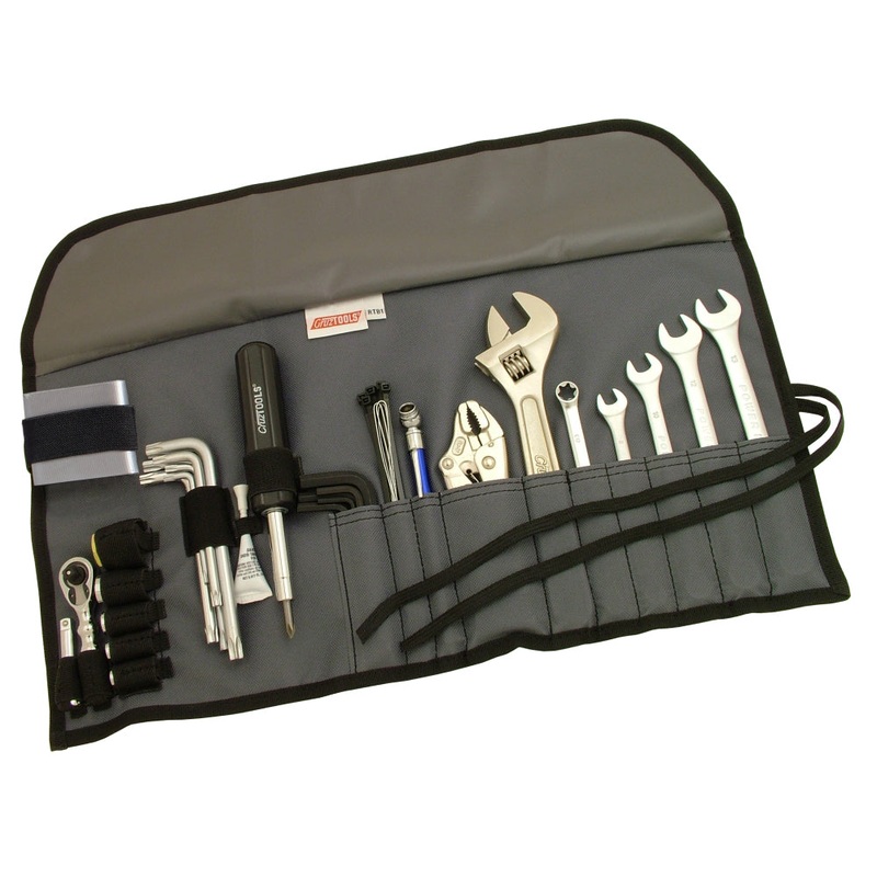 The perfect tool kit for 2018 and older BMW motorcycles. Designed for road-side repairs and adjustments. Includes 6 torx keys, 5 hex keys, 4 metric wrenches, a mini ratchet with 2 extension, 4 sockets and a 19x22mm axle adapter. The kit is rounded out with a 6-in-1 screwdriver, locking pliers, adjustable wrench, cable ties, mechanics wire, duct tape, thread locker, and a tire gauge. The tools stay organized in a heavy-duty roll-up pouch and come with a Lifetime Guarantee no questions asked!