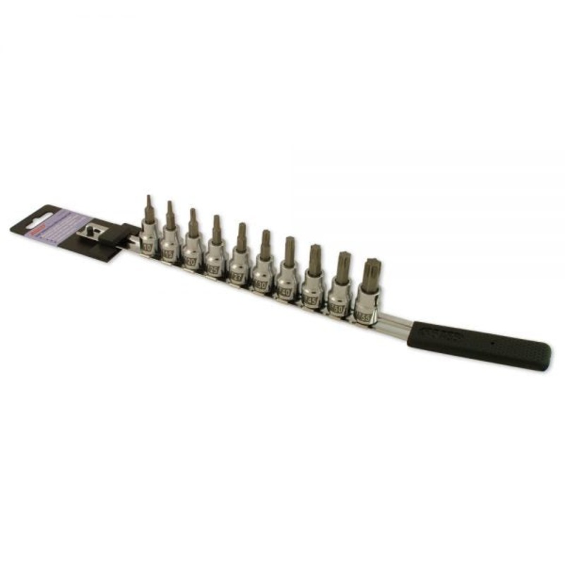 Professional strength socket bits made from heat-treated S2 alloy. The 3/8 drive works well with ratchet, T-handle, or cordless driver in the shop. Bit size is laser imprinted for easy identification. The 10-piece Torx set includes a durable metal storage
