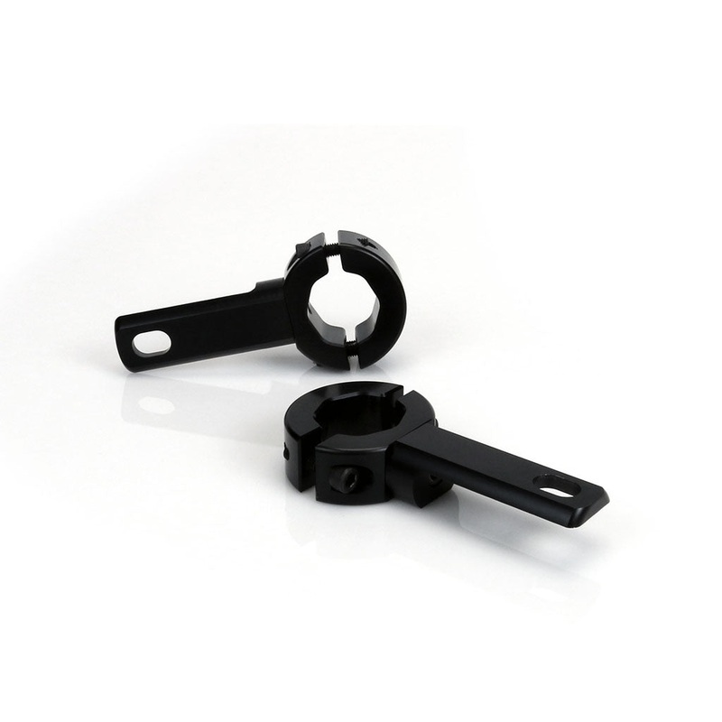 These clamps are intended for mounting lights to OEM or aftermarket crash bars, handlebars and frame tubes commonly found on adventure bikes, dual sportbikes, ATVs and snowmobiles. The clamps allow the lights to be positioned to the inside of the bars, ensuring they will be protected in a tip over.