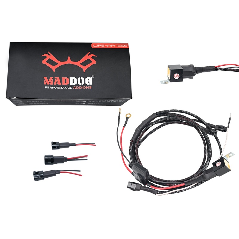 Maddog Universal Wire HarnessDescription:Our Standard Wiring Harness features high-quality water-resistant connectors and other components,is designed to power ANY Auxiliary Light upto 10Amps / 100Watts .Braided mess sleeve for rugged production from dust,