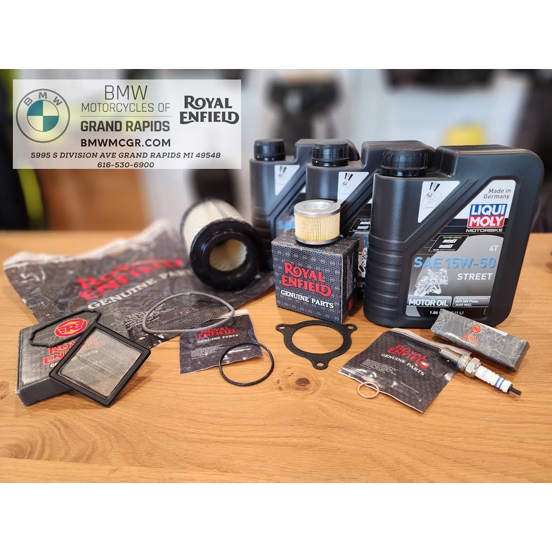 ROYAL ENFIELD FULL SERVICE KITfor 411 / HIMALYAN / SCRAM 2018-2023Contains:Qty 1 -COPPER WASHER, INSPECTION PLUG144846/AQty 1 -O-RING COVER574556/AQty 1 -OIL FILTER KIT888464Qty 3 -15W50 1L OIL3601-0693Qty 1 -OIL STRAINER KIT888460Qty 1 -AIR FILTER ELEMENT