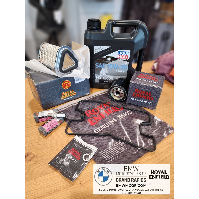 ROYAL ENFIELD FULL SERVICE KIT for 650 TWINQty 1 - OIL DRAIN PLUG WASHER 575630/BQty 1 - OIL FILTER 575139/FQty 4 - WASHER SEAL (CAM COVER) RLQ00063/DQty 1 - CYLINDER HEAD COVER GASKET 1570215/CQty 4 - OIL 15W50, 1L LIQUI MOLYQty 1 - AIR FILTER ELEMENT 576